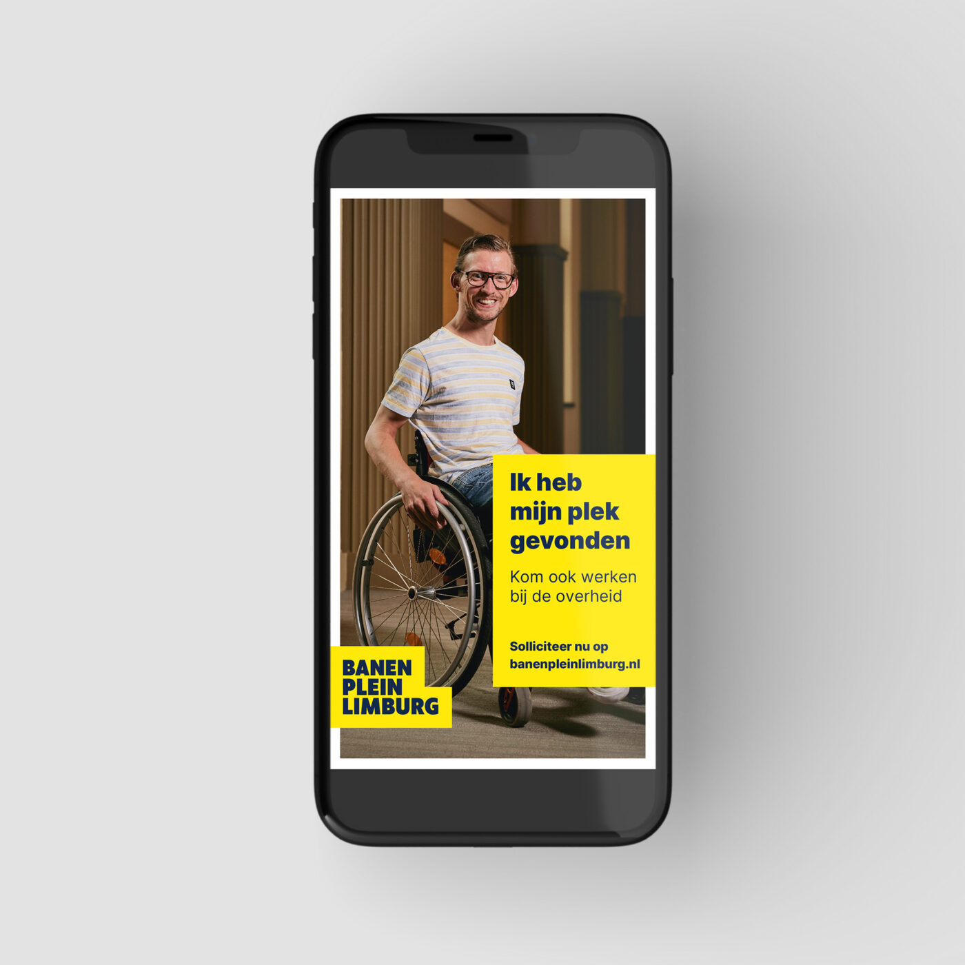 In de campagne zetten we in op ‘het vinden van je plek’ door Banenplein Limburg. In eerste instantie alleen op social media (Facebook, Instagram en Linkedin) en Google (Ads), maar later ook in de fysieke ruimte (2-signs, borden langs de snelweg).