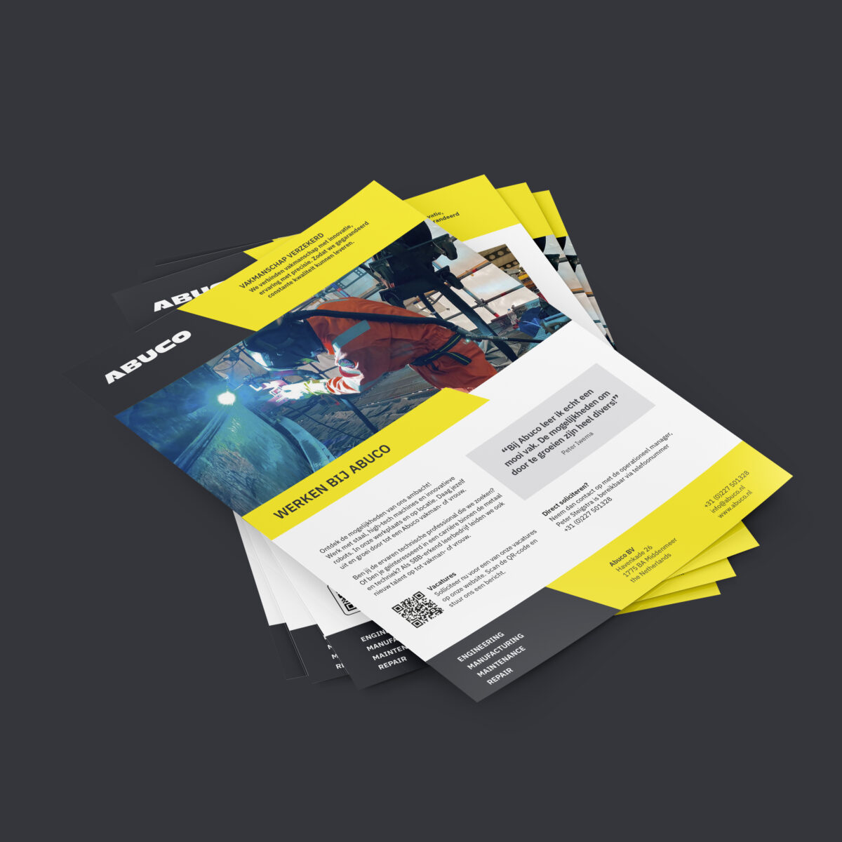 Daarnaast bedachten we een simpel, maar effectief ‘foldertje’ op het formaat van een visitekaartje. Deze werden uitgedeeld aan ondernemers door medewerkers van het Werkgevers Service Punt (WSP), RPA en het Ontwikkelingsbedrijf NHN tijdens evenementen zoals Hallo 2024.